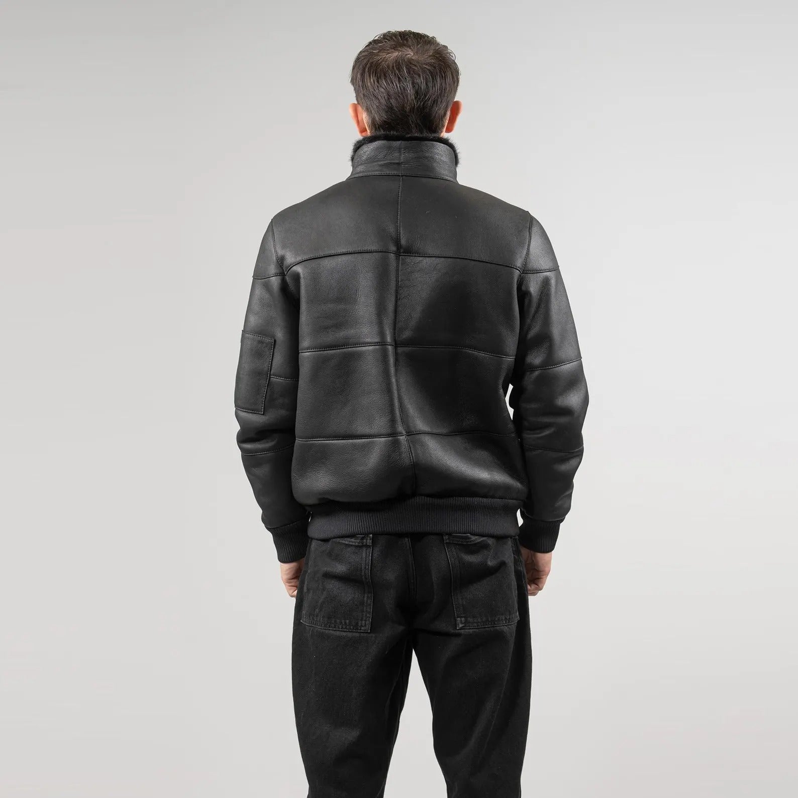 This timeless bomber jacket is crafted from premium black leather with a soft shearling lining, ensuring both warmth and style. Featuring a high collar, ribbed cuffs, and functional zip details, it blends rugged durability with modern sophistication. The tailored fit makes it versatile for casual outings or smart streetwear looks, offering a refined balance of comfort and edge. A must-have staple for any contemporary wardrobe.
