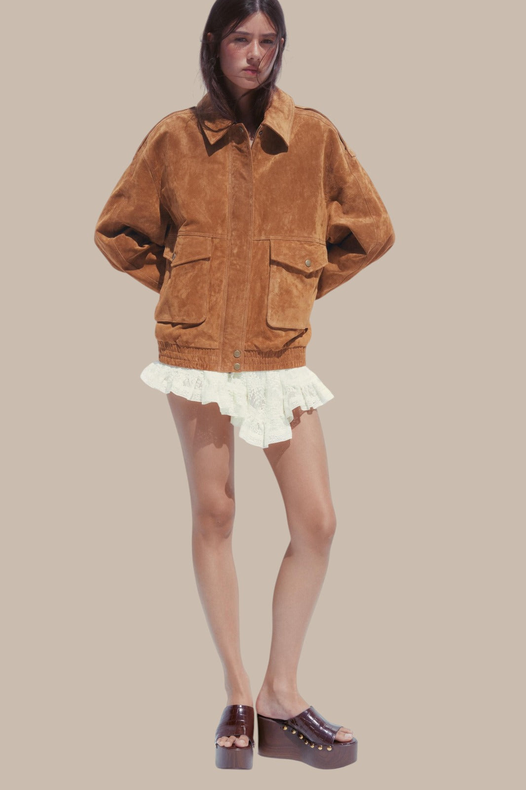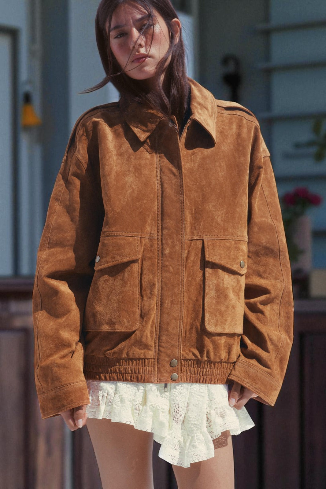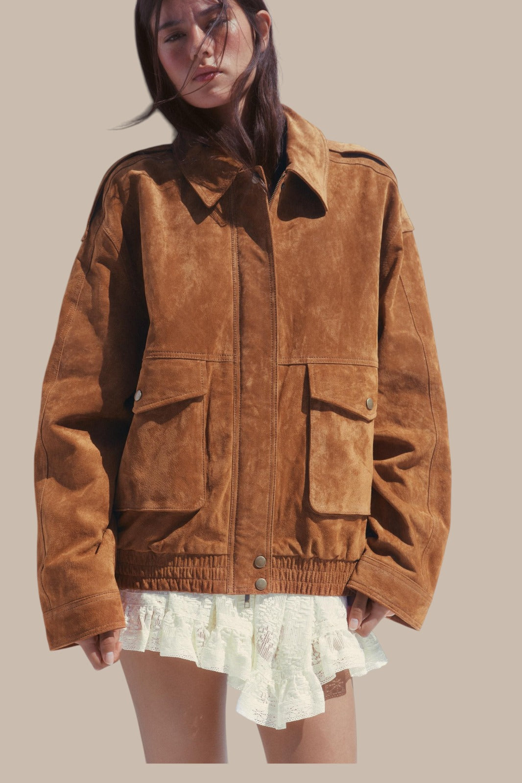 Elevate your outerwear game with this oversized brown suede utility jacket. Crafted from soft faux suede for a luxurious feel, this jacket features wide front flap pockets, snap-button closure, and subtle shoulder detailing. Its relaxed fit and earthy tone make it a versatile layering piece for both urban and casual looks. Pair it with dresses, jeans, or skirts for effortless chic style.